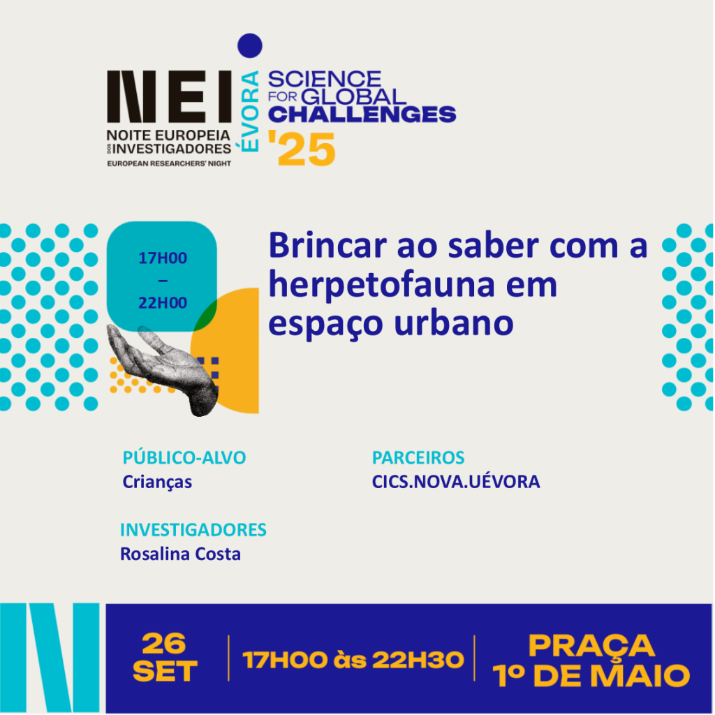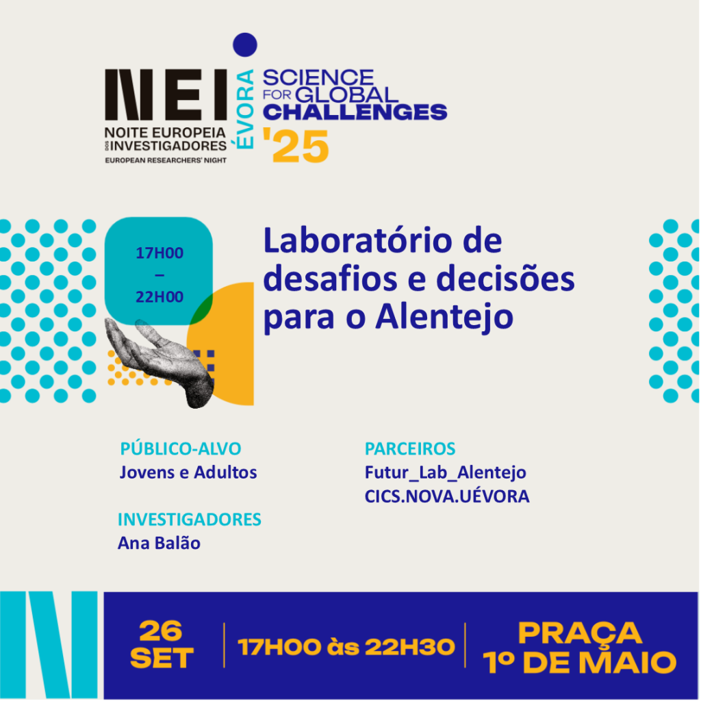 Amanhã, dia 26 de setembro, o CICS.NOVA vai marcar presença na Noite Europeia dos Investigadores com duas atividades dinamizadas pelo CICS.NOVA.UÉVora, na Praça 1º de Maio.