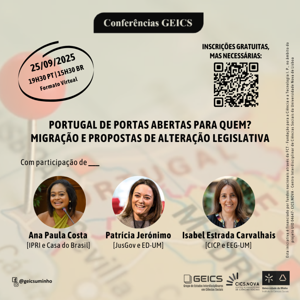 No próximo dia 25 de setembro de 2025 decorrerá, pelas 19H30 (PT)/15H30 (BR) e em formato exclusivamente virtual, uma Conferência GEICS dedicada à temática “Portugal de portas abertas para quem? Migração e propostas de alteração legislativa”. Procurar-se-á analisar os desafios e oportunidades colocados pelas dinâmicas migratórias atuais, bem como as propostas de alteração legislativa em curso.