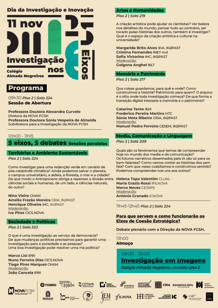 No próximo dia 11 de novembro, o Colégio Almada Negreiros será palco de mais uma edição do Dia da Investigação e Inovação da NOVA FCSH (DII), sob o tema “Investigação nos Eixos”. O evento convida docentes, investigadores/as, doutorandos/as e funcionários/as a um dia de reflexão, debate e partilha sobre a investigação que marca a identidade da NOVA FCSH e o seu compromisso com uma ciência aberta, crítica e voltada para a sociedade.
